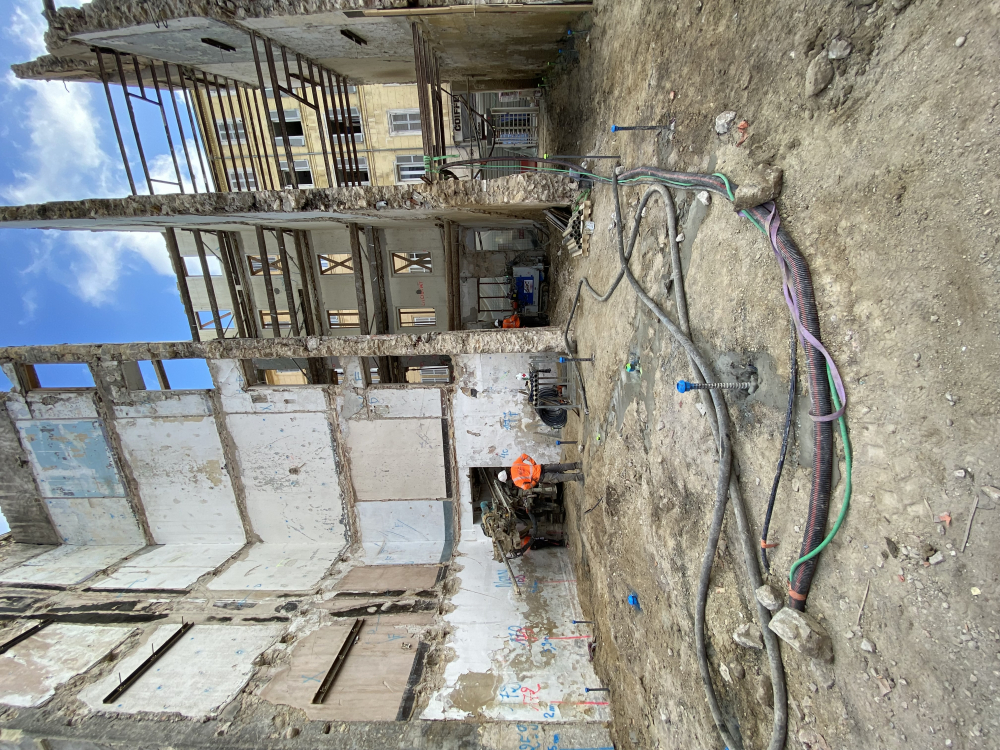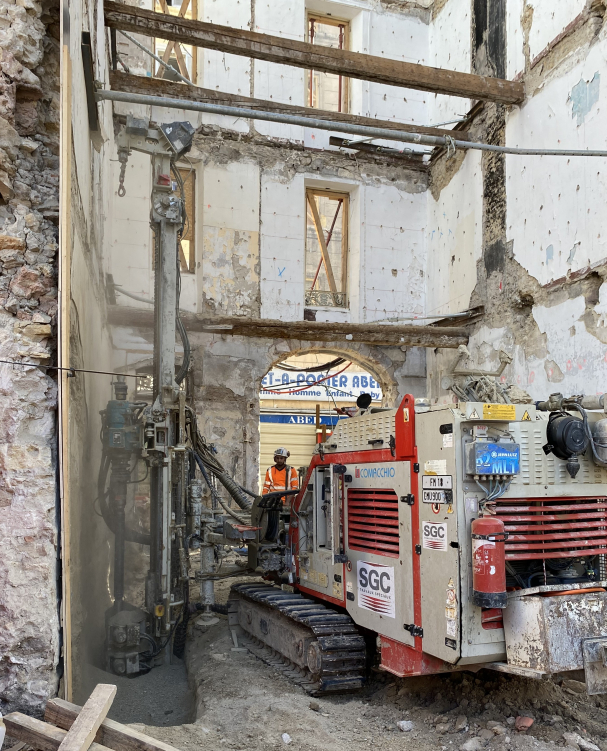 Au programme 285 micropieux diamètre 180mm à 11ml de profondeur en moyenne. Une grande majorité des micropieux permettra de reprendre les fondations de la structure existante conservée et une seconde partie servira de fondation aux nouveaux éléments de structure.