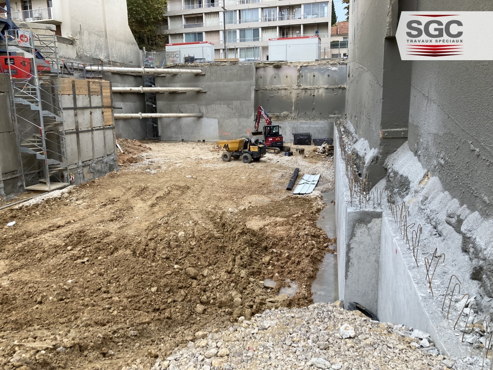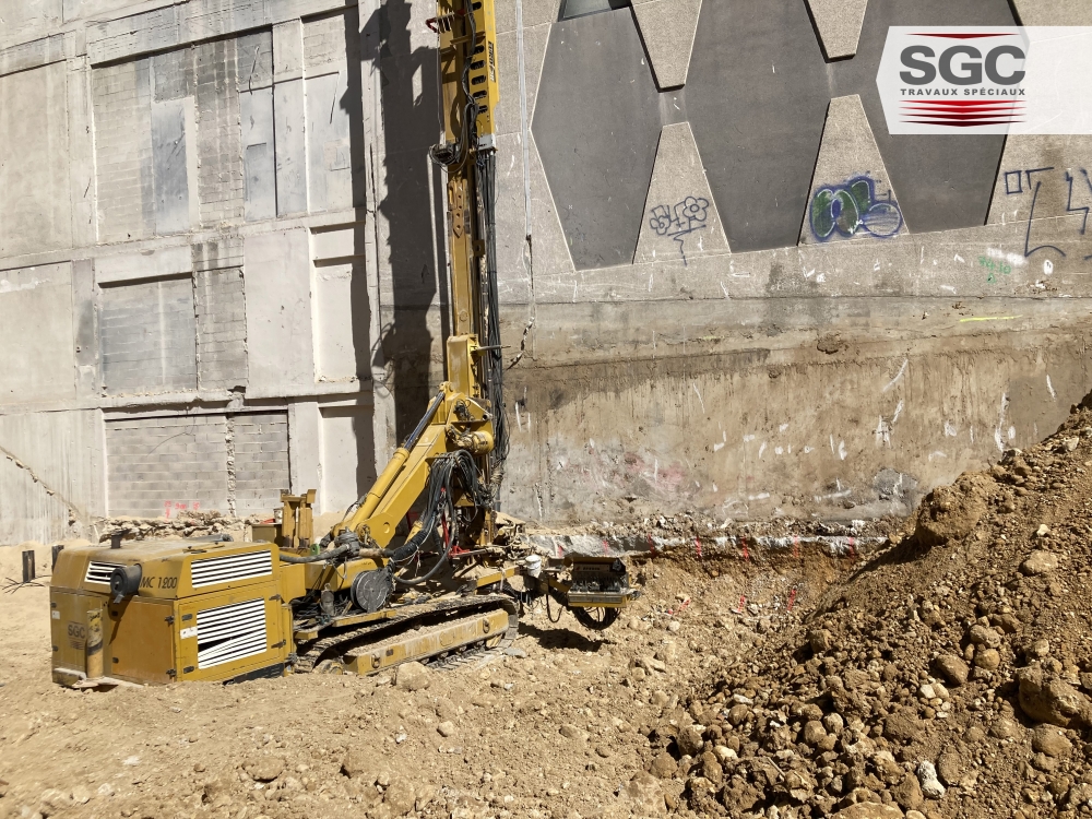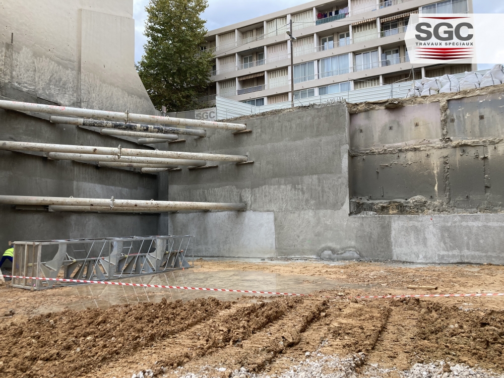 571.9 m² de paroi microberlinoise définitive clouée + butonnée et 258 m² de paroi berlinoise provisoire clouée.